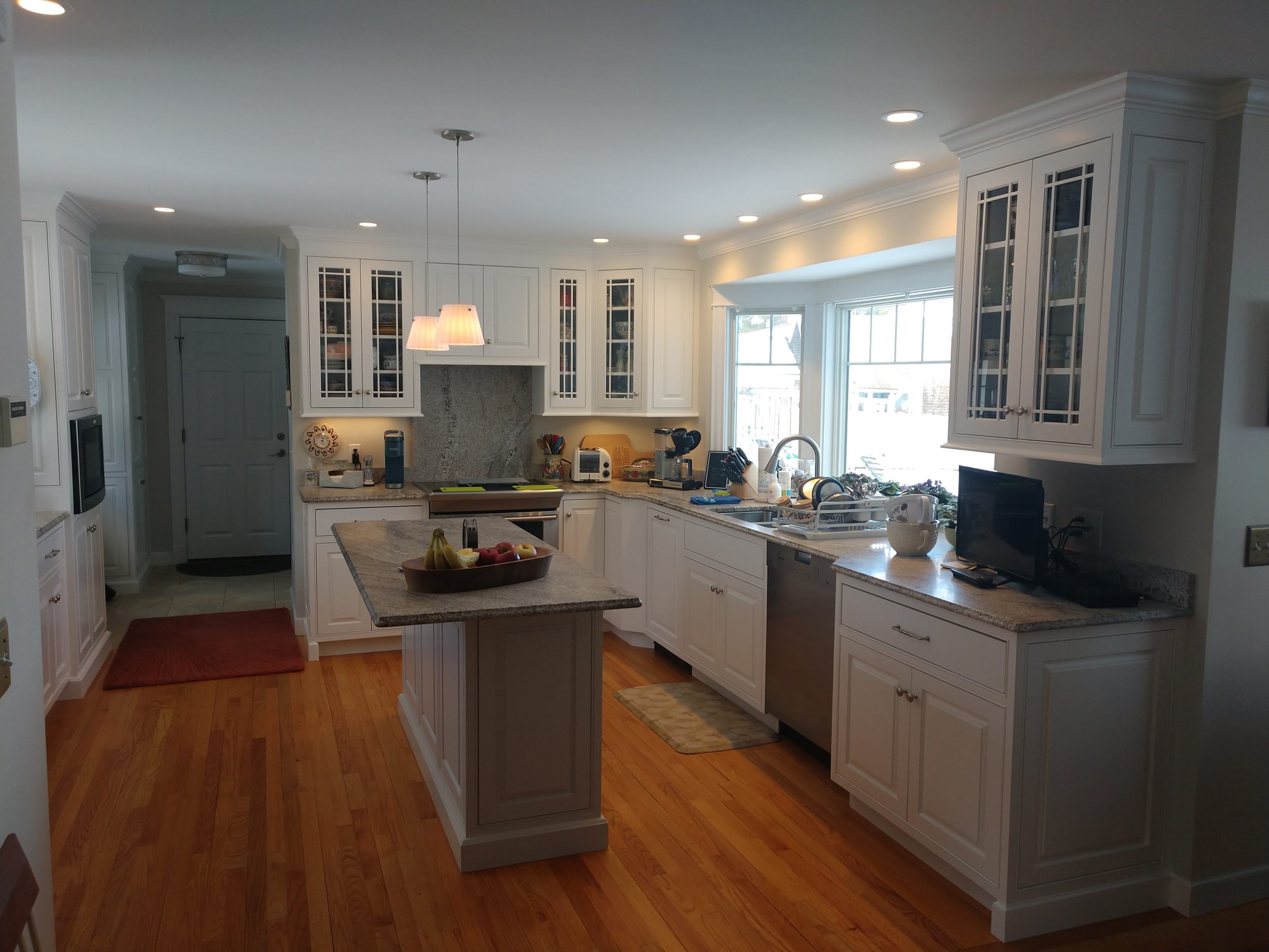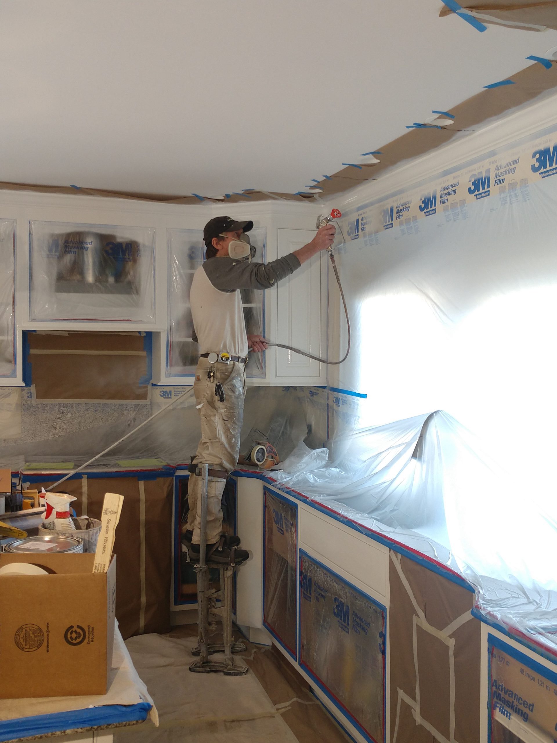 Bonnie’s kitchen was a very nice high-end kitchen. She wanted a fresh coat of paint on all the cabinets, same color, except for the island, which she wanted changed to a light gray color, to match the fresh coat of paint on the walls. Everything was masked off and the cabinet end-panels and face frames were re-sprayed on-site. The doors and drawers were sprayed in my shop. The final results looked like a brand new kitchen, with the same type factory sprayed look/finish.