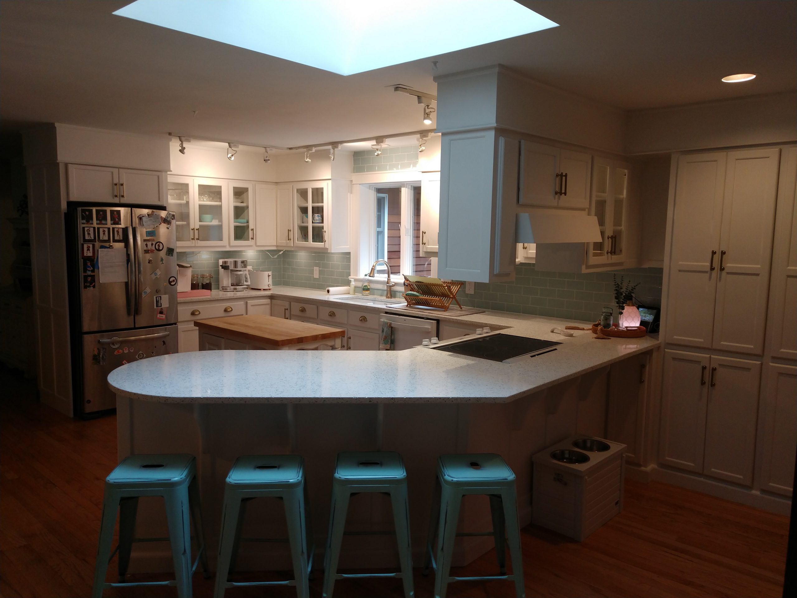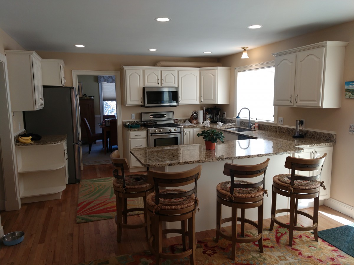 “If anyone is thinking about painting their kitchen cabinets, I have a recommendation. We just finished our kitchen remodel with Cabinet Makeovers Maine, and they were fantastic. The quality of their work is top-notch, they show up on time, have creative ideas, and are great to work with. They painted our 25-year-old pine cabinets, replaced hinges/slides, painted our ceiling, built a custom window, did the backsplash, and helped with other miscellaneous stuff, all in about 4 weeks. Here’s a before and after pic.”